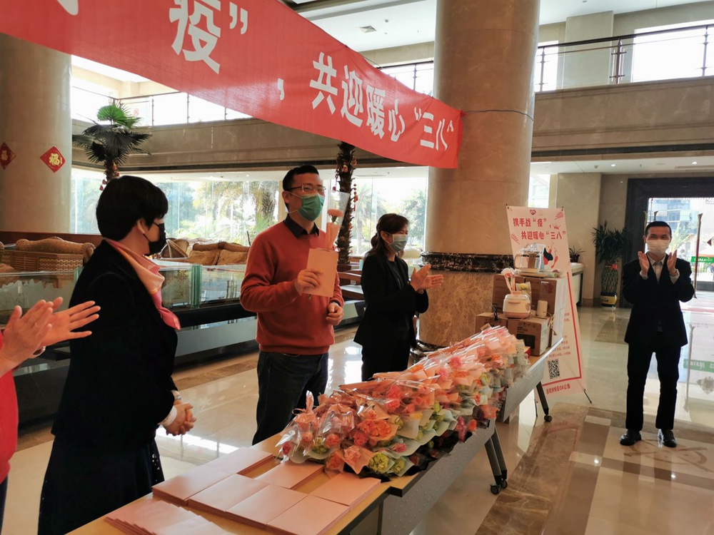 随后总裁兼CEO孙亦农先生、首席财务官裴红兰女士、首席营销官纪伟如女士、内审中心副总、银鹭食品党支部书记林丽霜女士为获得一等奖的职工们送上鲜花、礼品。仪式简单而温馨,虽然大家都戴着口罩,但口罩挡不住她们的美丽,面对疫情,我们云拥抱、云互动,祝福是远程的,心却是如此贴近,这个3.8节过得比往年更有意义。